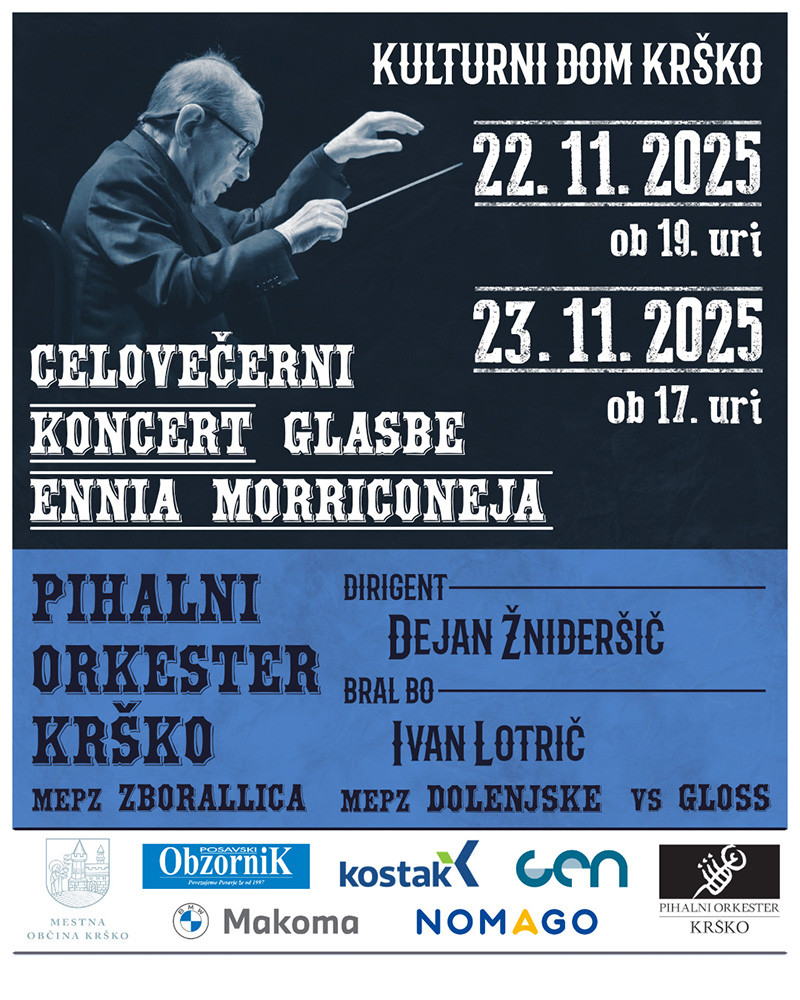 Organizator: KD Pihalni orkester Krško "Doživite nepozaben glasbeni večer, posvečen legendarnemu skladatelju Enniu Morriconeju! Na odru se bodo združili Pihalni orkester Krško ter MePZ Zborallica in Dolenjske, ki bodo podali mogočno izvedbo njegovih brezčasnih filmskih mojstrovin. Pridružite se nam na koncertu, kjer se bo prepletla čarobna orkestralna moč z ubranostjo glasov in pričarala edinstveno doživetje za vse ljubitelje filmske in koncertne glasbe. "